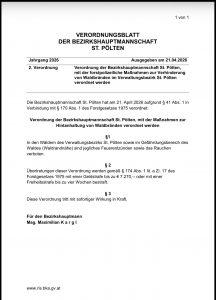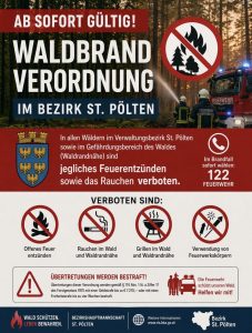 Gestern, 21.04.2026, ist die Waldbrandverordnung für den Verwaltungsbezirk St. Pölten in Kraft getreten.