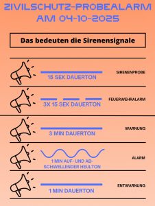 Morgen, Samstag 04.10.2025, ist es wieder so weit … der alljährliche Zivilschutz-Probealarm findet in der Zeit von 12:00 Uhr und 12:45 Uhr statt.